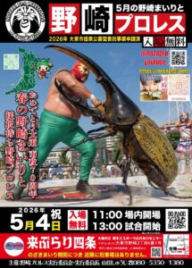 2026年2月6日 / 最終更新日時 : 2026年2月7日 やまだ しゅうじ 2026野崎プロレス 【野崎プロレス2026】大東市政70周年を勝手に背負って、今年も5/4開催します! 皆さん、こんにちは!野崎プロレスです。 2026年、我らが大東市は市政70周年という記念すべき節目を迎えます。 そんなおめでたい年に、我々野崎プロレスが黙っているわけにはいきません! 実は今回、市政70周年記念の「提案公 […]